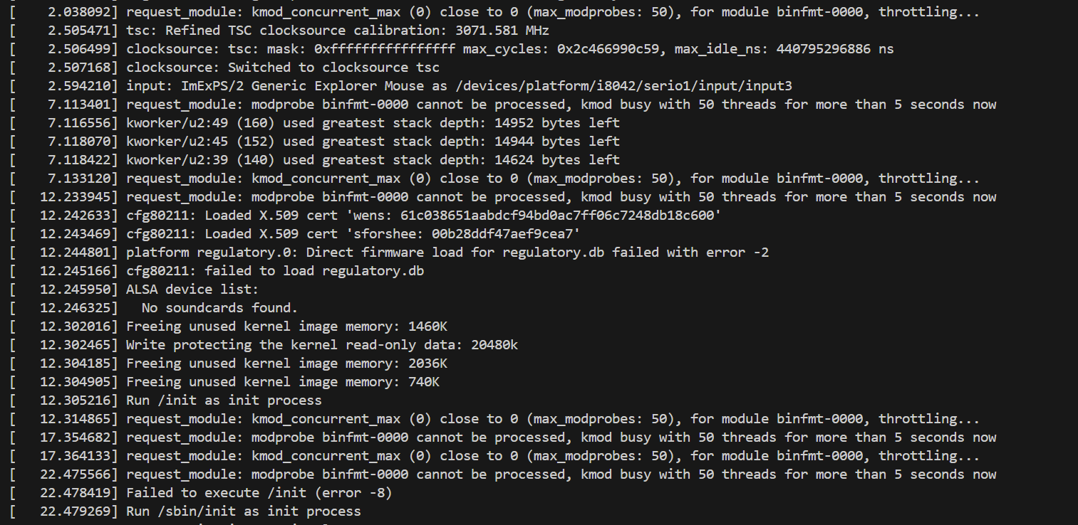 misc January 20, 2025 problem shooting not processed modprobe binfmt-0000 problem on cpio compilation modprobe binfmt-0000 cannot be processed, kmod busy with 50 threads for more than 5 seconds now #cpio #kernel pwn problem shooting